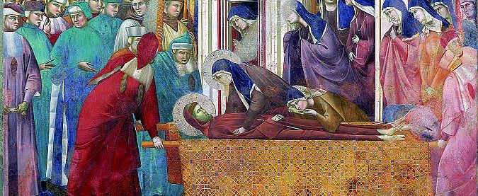 Am folgenden Vormittag überführt Assisi Franziskus nach San Giorgio, um ihn da zu bestatten: Das Giottofresko zeigt Jacoba bei diesem festlichen Zug vor San Damiano mit blonden Zöpfen und in rotem Kleid, eine Hand an der Bahre des Poverello und Klara ganz nahe. Nach der Bestattung reist sie nach Rom zurück, nimmt das Kissen mit, auf dem der Kopf des Sterbenden ruhte, und kleidet dieses in wertvollen Stoff mit der Inschrift: „Confessor Domini Franciscus ad ethera migrans hoc capitale tenuit super caput almum. Valete in Domino et orate pro me“ (Gottes Bekenner Franziskus hat, als er in den Himmel wanderte, dieses Kissen unter seinem segensvollen Kopf gehabt. Seid stark in Gott und betet für mich).
